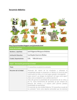 La unidad didáctica trata sobre los animales y su hábitat. Los objetivos son que los estudiantes aprendan el vocabulario básico sobre los animales, realicen clasificaciones de los animales según diferentes criterios, y conozcan la utilidad de los animales para los seres humanos. La unidad empleará actividades lúdicas como canciones, cuentos y videos para enseñar a los estudiantes sobre las características y alimentación de los animales.