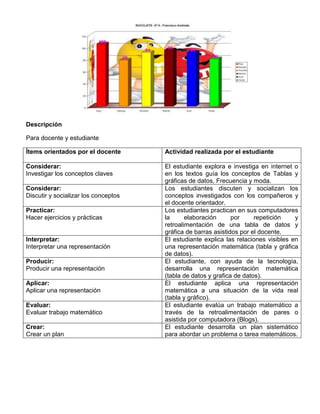 El documento describe una actividad de aula en el área de matemáticas y ciencias naturales para estudiantes de cuarto grado. La actividad se enfoca en la elaboración de tablas y gráficas de datos para resolver problemas utilizando representaciones como pictogramas, gráficas de barras y diagramas. Los objetivos específicos son representar, comparar e interpretar datos presentados en tablas y gráficas.