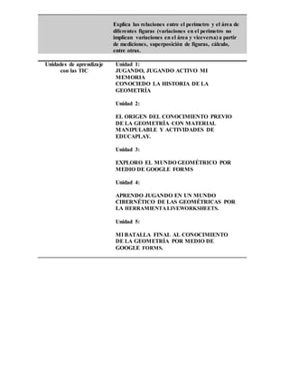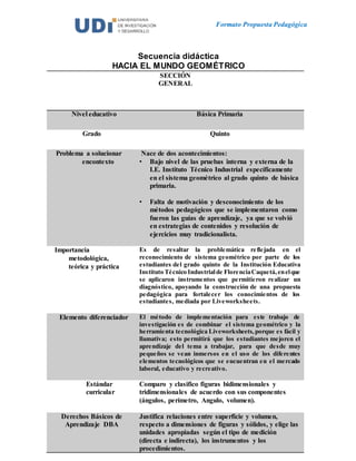 Este documento presenta una propuesta pedagógica para fortalecer los conocimientos de geometría en estudiantes de quinto grado. La propuesta consiste en una secuencia didáctica de 5 unidades que utilizan herramientas tecnológicas como Liveworksheets. Cada unidad incluye actividades para estudiantes y maestros, recursos y una línea de tiempo. La propuesta busca mejorar los resultados en pruebas internas y externas sobre geometría a través de actividades lúdicas y el uso de la herramienta Liveworksheets.