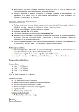 Este documento presenta una secuencia didáctica para un proyecto tecnológico dirigido a estudiantes de 4° grado. Los objetivos generales son gestionar y desarrollar proyectos tecnológicos medianos que respondan a demandas y evalúen consecuencias. Los contenidos incluyen conceptos de proyectos tecnológicos, procedimientos como diseñar bocetos y construir prototipos, y actitudes como ser usuarios inteligentes de tecnología. La metodología implica presentar proyectos pasados y