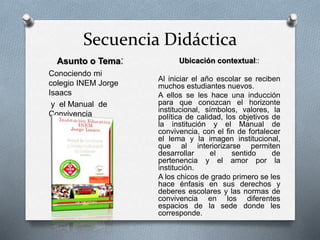 Este documento describe una secuencia didáctica para familiarizar a los nuevos estudiantes con el colegio INEM Jorge Isaacs a través de varias actividades. El objetivo es fortalecer la imagen institucional y enseñar a los estudiantes sobre los símbolos, valores, política de calidad y manual de convivencia de la escuela. Las actividades incluyen recorrer la escuela, decorar el salón de clase con los símbolos, aprender el himno, completar fichas sobre derechos y deberes, y juegos de roles sobre los valores.
