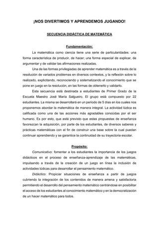 Este documento presenta una secuencia didáctica de 5 días sobre matemática para estudiantes de primer grado. La secuencia utilizará juegos didácticos como "Más o menos" y "La caja tapada" para que los estudiantes aprendan sobre números naturales de manera divertida. Los objetivos son que los estudiantes usen escalas numéricas y resuelvan problemas utilizando números.
