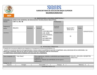 Este documento presenta una secuencia didáctica para la asignatura de Inglés I. La secuencia se centra en enseñar el uso de los condicionales, adverbios de frecuencia y verbos como "can" a través de ejercicios lexicográficos. Las actividades incluyen proyectar diapositivas sobre rutinas diarias, escribir oraciones descriptivas y crear líneas de tiempo resaltando los adverbios de frecuencia. Los estudiantes también resolverán ejercicios y harán una exposición en equipo sobre el tema. El