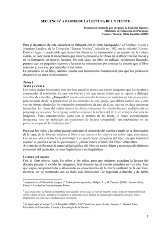 El documento presenta una secuencia didáctica de 6 tareas para trabajar la lectura y comprensión de un cuento infantil titulado "¡Ronquidos!". La secuencia incluye actividades como leer el cuento en voz alta, identificar personajes e intentos de solucionar problemas, dramatizar escenas, y completar oraciones con palabras del cuento para reforzar la lectoescritura. El objetivo es desarrollar la comprensión lectora y las habilidades alfabéticas de los estudiantes.