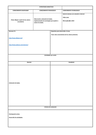 Este documento presenta un plan de clase para abordar el tema de los colores secundarios en grado segundo. El objetivo es que los estudiantes utilicen adecuadamente los colores secundarios en sus trabajos escolares. La clase incluirá contenidos conceptuales, procedimentales y actitudinales sobre los colores secundarios y cómo se forman a partir de los primarios. El profesor explicará el tema y los estudiantes pintarán dibujos usando los colores secundarios. Al final, cada estudiante expondrá su dibujo para evalu