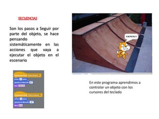 El documento describe tres secuencias de control de objetos en Scratch. La primera secuencia controla un objeto con los cursores del teclado. La segunda secuencia también controla un objeto con los cuatro cursores del teclado. La tercera secuencia usa la instrucción de deslizar para desplazar un objeto de un punto a otro en el escenario.