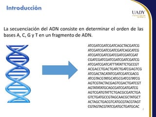 Este documento describe las principales tecnologías de secuenciación masiva de ADN, incluyendo el método de Sanger, secuenciación por terminación reversible cíclica y nanoporos. Explica los pasos de preparación de la muestra, generación de clusters, secuenciación e interpretación de datos para cada método. También compara ventajas y desventajas de las diferentes plataformas de secuenciación.