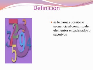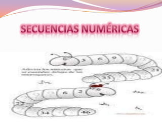 Este documento define una secuencia numérica como un conjunto de elementos numéricos ordenados y encadenados. Explica que completar una secuencia numérica implica descubrir la relación entre los primeros términos para predecir los siguientes, y proporciona ejemplos de secuencias numéricas parciales que deben completarse descubriendo la regla subyacente.