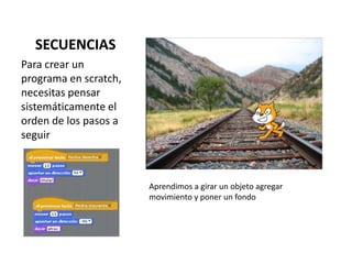 El documento presenta 4 secuencias sobre cómo crear programas en Scratch, incluyendo cómo agregar movimiento a objetos, controlar objetos con el teclado, hacer que objetos se deslicen por el escenario, y combinar el deslizamiento con cambios de disfraces.