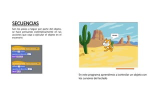 Este documento presenta tres secuencias para controlar un objeto en Scratch. La primera secuencia controla un objeto con los cuatro cursores del teclado. La segunda secuencia también controla un objeto con los cuatro cursores. La tercera secuencia usa la instrucción de deslizar en Scratch para desplazar un objeto de un punto a otro.