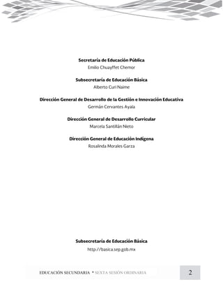 El documento trata sobre la sexta sesión ordinaria de educación secundaria. Incluye información sobre los objetivos y metas de la sesión, así como una encuesta sobre las prácticas de liderazgo directivo y una discusión sobre los desafíos y estrategias de mejora continua en la escuela.