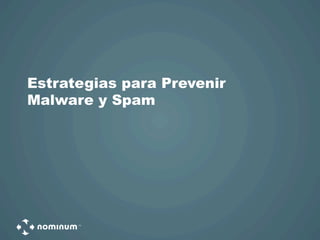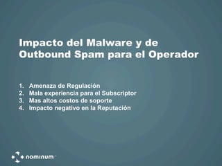 Este documento describe las amenazas de malware y spam saliente y las estrategias para combatirlas. El malware se propaga a través de bots que se comunican con servidores de comando y control a través de DNS. Esto causa problemas como spam, robo de datos, y experiencias negativas para los usuarios. La solución de Nominum usa detección de dominios maliciosos, mitigación bloqueando consultas DNS, y visualización de informes para ayudar a los proveedores de servicios a lidiar con estas amenazas.