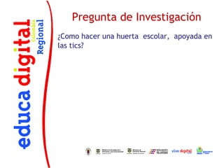 Este documento describe un proyecto para establecer una huerta escolar apoyada en TIC en la Institución Educativa Balcones sede Casa Blanca. El proyecto busca fomentar aprendizajes significativos a través de la interdisciplinariedad e incentivar la participación de la comunidad educativa. Se detallan los objetivos, la justificación, la metodología, conceptos clave, cronograma, software y herramientas que se utilizarán, y la evaluación y seguimiento del proyecto.