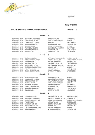 Este documento presenta el calendario de partidos de la 2a Juvenil Gran Canaria para la temporada 2012/2013. Está dividido en 12 jornadas con los días, horas y lugares de los partidos de cada uno de los equipos que compiten en el Grupo 2.