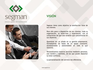 Segman busca satisfacer totalmente a sus clientes ofreciendo soluciones personalizadas y un solo punto de contacto para todas sus necesidades de mantenimiento e instalaciones. La empresa se especializa en facility management, obras e instalaciones, ingeniería y proyectos, y eficiencia energética, con el objetivo de ayudar a sus clientes a gestionar sus negocios y ahorrar en costes energéticos.
