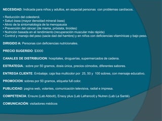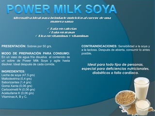 Este documento presenta un suplemento alimenticio llamado Power Milk Soya. Es bajo en calorías y grasas, rico en vitaminas y se presenta en sobres individuales para disolver en agua. Está indicado para personas con deficiencias nutricionales, diabéticos o con falla cardíaca. Su objetivo de mercado son personas interesadas en su salud en el Valle del Cauca, Cauca y Nariño.