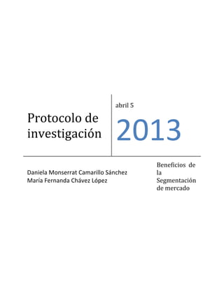 Este documento presenta un proyecto de investigación sobre los beneficios de la segmentación de mercado. Incluye una introducción al tema, una justificación de por qué el tema es relevante, los objetivos y preguntas de investigación, un marco teórico sobre segmentación de mercado, y detalles sobre el diseño de investigación propuesto. El objetivo general es comprobar que la segmentación de mercados es importante para el éxito de los productos, mientras que los objetivos específicos incluyen identificar qué tipo de segmentación es más efectiva y distinguir