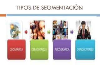 La segmentación de mercados divide el mercado en grupos con características y necesidades similares. Existen varios criterios para la segmentación como los beneficios buscados, frecuencia de uso, condiciones de compra, y características psicográficas. La segmentación es importante hoy en día porque los consumidores tienen una amplia gama de necesidades que una sola empresa no puede satisfacer, por lo que se segmentan los mercados para dirigirse a grupos específicos.