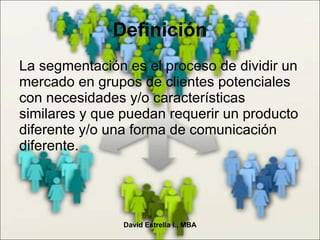 El documento describe los conceptos y procesos clave de la segmentación de mercados. Explica que la segmentación divide el mercado en grupos con necesidades similares que pueden requerir productos o comunicaciones diferentes. Luego detalla los objetivos, estrategias, beneficios y pasos del proceso de segmentación, incluida la definición del mercado, identificación de segmentos, selección de segmentos objetivo y desarrollo de un plan de acción.