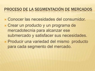 La segmentación de mercados es el proceso de dividir un mercado heterogéneo en subgrupos más homogéneos de acuerdo con las necesidades y características de los consumidores. Esto permite a las empresas desarrollar productos y estrategias de marketing específicas para cada segmento, lo que puede resultar en mayores ventas y mejor servicio al cliente. Algunos criterios comunes para segmentar mercados incluyen factores geográficos, demográficos, psicográficos y la posición del cliente.
