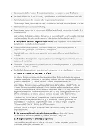 Este documento describe el proceso de segmentación de mercados y los diferentes enfoques y técnicas involucrados. Explica que la segmentación implica dividir un mercado heterogéneo en segmentos homogéneos para adaptar mejor la oferta a las necesidades de los clientes. Luego detalla los criterios de segmentación, las estrategias para seleccionar los mercados objetivo, y las siete fases del proceso de segmentación e identificación del mercado meta. Finalmente, presenta brevemente algunas técnicas y modelos utilizados para la segmentación.