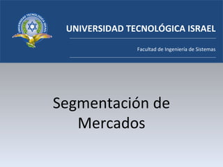 Este documento habla sobre la segmentación de mercados. Explica que la segmentación de mercados consiste en dividir el mercado total en grupos más pequeños que sean internamente homogéneos. Menciona que una buena segmentación debe resultar en segmentos similares internamente pero diferentes entre sí y lo suficientemente grandes. También describe los tipos de segmentación como la geográfica, demográfica, psicográfica y por comportamiento. Finalmente, resume el proceso de segmentación.