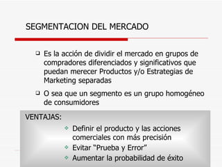 El documento habla sobre la segmentación del mercado. Explica que la segmentación es dividir el mercado en grupos diferenciados de compradores que pueden merecer productos y estrategias de marketing separadas. Detalla algunos criterios para segmentar como demográficos, geográficos y de comportamiento. También menciona trampas comunes en la segmentación como seguir el esquema del competidor o usar siempre los mismos criterios demográficos. Resalta que la segmentación es una herramienta poderosa para identificar grupos mediante investigación de mercado.