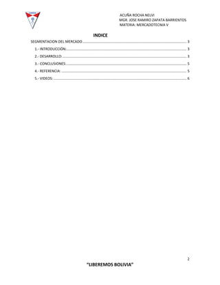 Este documento presenta información sobre la segmentación de mercados. Explica que la segmentación implica dividir el mercado en subgrupos más pequeños que comparten características y necesidades similares. Describe los tipos de segmentación como geográfica, demográfica y conductual. También cubre las variables utilizadas para la segmentación, los beneficios de segmentar el mercado, ejemplos de segmentos y los requisitos para una buena segmentación.