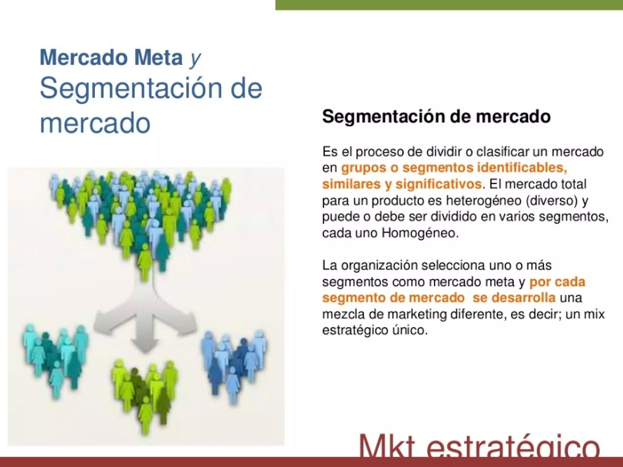 El documento describe el proceso de segmentación de mercados, incluyendo la identificación de variables para segmentar el mercado y desarrollar perfiles de segmentos. Explica cómo seleccionar el público objetivo evaluando el atractivo de cada segmento y seleccionando los segmentos más adecuados. También cubre el posicionamiento mediante el desarrollo de estrategias y marketing mix para cada segmento seleccionado.