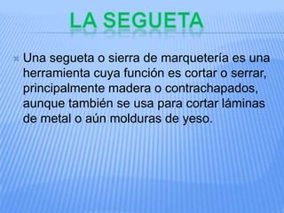 Este documento describe diferentes tipos de sierras, incluyendo seguetas y sierras de arco. Explica que las seguetas se usan principalmente para cortar madera o contrachapados, pero también metal u otros materiales. Detalla normas de seguridad para el uso de seguetas y describe que las sierras de arco utilizan un movimiento de corte alternativo en la hoja montada de manera horizontal.