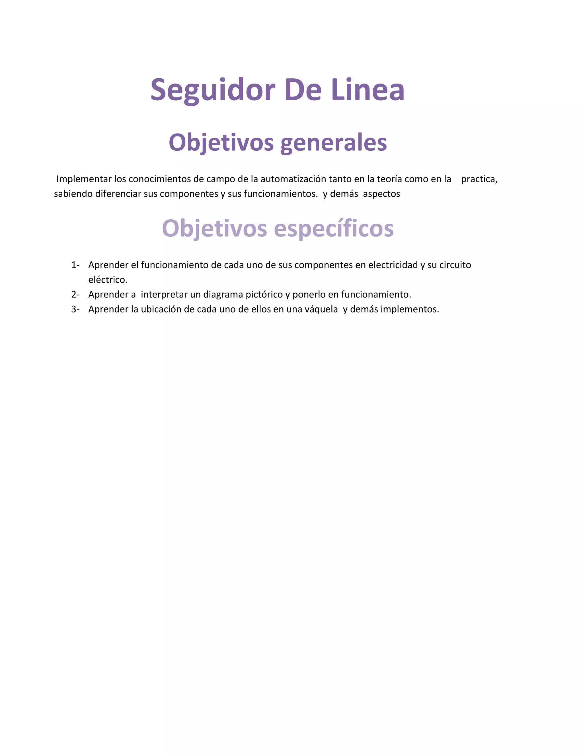Este documento describe los objetivos y componentes de un robot seguidor de línea. Los objetivos generales son implementar conocimientos de automatización en teoría y práctica identificando sus componentes y funcionamiento. Los objetivos específicos incluyen aprender el funcionamiento de cada componente eléctrico, interpretar diagramas, y ubicar componentes en el robot. Se incluye un diagrama y lista de materiales requeridos para el robot, como motores, baterías, resistencias, transistores y otros componentes electrónicos.