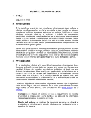 Este documento describe un proyecto de un carrito seguidor de línea. El proyecto tiene el objetivo de demostrar la tecnología de un seguidor de línea construido con PIC y sensores infrarrojos. El carrito usa sensores para detectar una línea negra en el suelo y seguirla, guiándose por la línea. El documento explica los materiales, métodos y funcionamiento del carrito seguidor de línea.