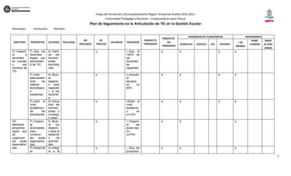 Este documento presenta los objetivos, propósitos y acciones de un plan de seguimiento para la articulación de las TIC en la gestión escolar de una institución educativa. Se detallan tres objetivos principales: 1) capacitar a los docentes, 2) organizar aulas especializadas mediante proyectos, y 3) integrar a la comunidad. Se describe el estado de las acciones y productos, así como los indicadores e instrumentos tecnológicos utilizados. Finalmente, se presenta un formato para describir proyectos académicos y estable