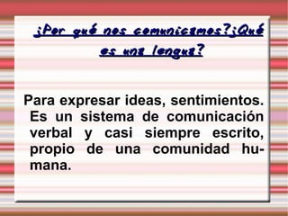 El documento habla sobre las lenguas y la comunicación. Explica que las lenguas se desarrollan para expresar ideas y sentimientos, y que el español proviene del latín que hablaban los antepasados en España. También discute por qué se habla más de un idioma en España, las consecuencias económicas y sociales de la expansión de un idioma, y la importancia de proteger las lenguas minoritarias.