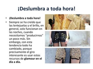 Este documento describe las tendencias de moda para el 2013, incluyendo prendas con detalles metálicos como lentejuelas, brillantina, tachas y púas. Señala que estos elementos de glamour ya no solo se usan de noche, sino que también son adecuados para el día a día, y se pueden encontrar en blazers, tops, shorts, faldas y pantalones. También menciona el uso de tachas en cuellos de blusas, en casacas y shorts, así como vestidos y faldas con lentejuelas,