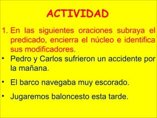 El documento proporciona una serie de oraciones y solicita identificar el predicado, núcleo y modificadores de cada una. Se pide subrayar el predicado, encerrar el núcleo y especificar los modificadores. Contiene 10 oraciones cortas con sujetos y verbos variados para practicar el análisis sintáctico.