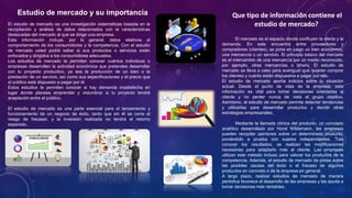 El documento proporciona información sobre estudios de mercado y su importancia. Explica que los estudios de mercado permiten conocer las características del mercado objetivo, el comportamiento de los consumidores y la competencia. También permite determinar si existe demanda insatisfecha para un producto o servicio y si este tendrá aceptación. Los estudios de mercado son esenciales para el lanzamiento y éxito de un negocio.
