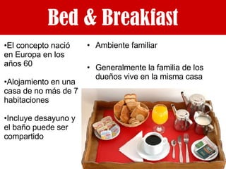 El documento presenta ideas para crear un Bed & Breakfast (B&B), que es un alojamiento familiar con desayuno incluido. Explica que un B&B suele tener menos de 7 habitaciones, combina alojamiento con otras actividades y ofrece una vida con bajos costos. Luego, detalla los tipos de habitaciones, servicios y tarifas de un ejemplo de B&B.