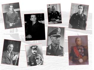El documento presenta breves biografías de importantes líderes políticos de la primera mitad del siglo XX como Franklin D. Roosevelt, Winston Churchill, Benito Mussolini, Adolf Hitler, Hermann Göring y Rudolf Hess. Se describe su origen, carrera política y papel durante eventos como la Primera y Segunda Guerra Mundial.