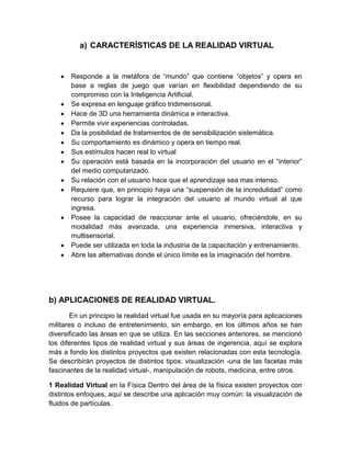 La realidad virtual es una tecnología que genera mundos virtuales tridimensionales con los que los usuarios pueden interactuar mediante dispositivos como cascos de realidad virtual. Se utiliza principalmente para simulaciones, entretenimiento y tratamientos médicos. Algunas aplicaciones incluyen simulaciones de vuelo, visualizaciones científicas, tratamientos de fobias en psicología y diseños arquitectónicos virtuales. Aunque tiene ventajas como permitir experiencias peligrosas de forma segura, también tiene desventajas como la complejidad té