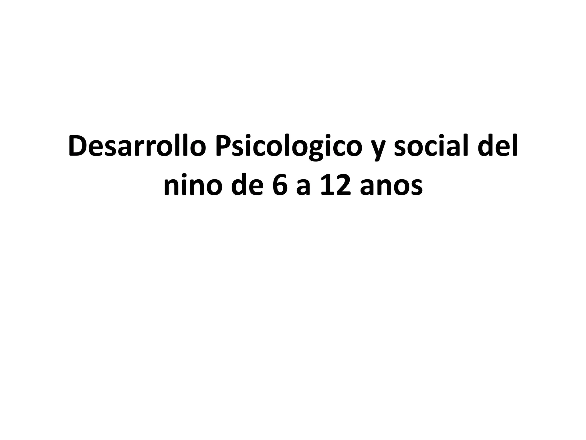El documento describe el desarrollo psicológico y social de los niños entre 6 y 12 años. En esta etapa, los niños continúan perfeccionando sus habilidades motrices y lenguaje. Se interesan por juegos más complejos y competitivos. También desarrollan una mayor capacidad intelectual, como pensamiento lógico y crítico. Es importante fomentar su autonomía pero mantener la supervisión de los padres. La escuela les ayuda a socializarse e independizarse.