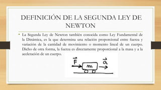 La segunda ley de Newton establece que la fuerza neta sobre un objeto es directamente proporcional a su aceleración. Si la masa es constante, la fuerza neta es igual a la masa por la aceleración. Esta ley se aplica para analizar el movimiento de bloques unidos por una cuerda sobre un plano inclinado, determinando primero la aceleración del sistema y luego la tensión del hilo.