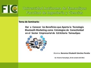 Este documento presenta la información sobre los beneficios de la tecnología Bluetooth marketing como estrategia de conectividad para empresas en Cd. Victoria, Tamaulipas. Explica que Bluetooth permitiría enviar publicidad sin costo a usuarios dentro de 100 metros y de forma ecológica. También describe diferentes equipos Bluetooth como Bluebox y OFX28NLR que permiten configurar y enviar campañas publicitarias a múltiples teléfonos simultáneamente. El objetivo es dar a conocer estas herramientas tecnológicas a empresarios locales.