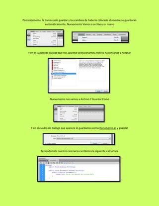 Este documento resume los pasos para crear un archivo de clase externa en ActionScript 3.0. Primero, se crea un símbolo con exportación a AS y se asocia con un archivo .as que contiene código. Luego, se cambia el nombre del archivo principal y se asocia a una nueva clase creada en otro archivo .as, permitiendo que el código externo controle el símbolo.