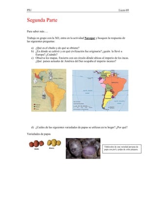 El documento proporciona preguntas sobre el chuño, un alimento tradicional andino obtenido de la papa. Pide a los estudiantes que busquen información sobre el origen del chuño en la civilización inca, los países que conformaban el imperio inca, variedades y valor nutricional de la papa, e instrucciones para obtener chuño a partir de un video. El propósito es que los estudiantes aprendan sobre este alimento tradicional andino y su historia cultural a través de una actividad de investigación grupal usando computadoras