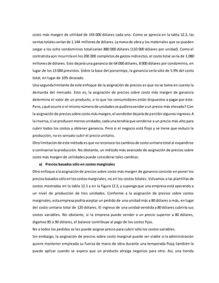El documento describe diferentes métodos para establecer precios de venta, incluyendo: 1) Costo total más margen de ganancia deseado, 2) Análisis de costos marginales, y 3) Análisis de punto de equilibrio. El método más común es establecer el precio para cubrir costos y generar ganancias, aunque tiene limitaciones como no considerar la demanda del mercado.