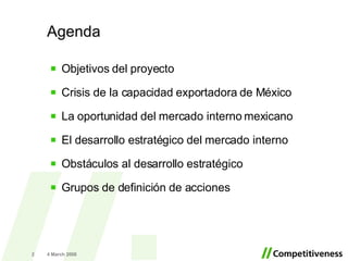 El resumen trata sobre una reunión para mejorar la competitividad de las empresas del sector en el Estado de México. Los objetivos incluyen mejorar la competitividad de las empresas, lograr que innoven continuamente para satisfacer las necesidades de los clientes, y mejorar el entorno para favorecer la innovación. Se discute la crisis de la capacidad exportadora debido a la competencia internacional y la oportunidad del mercado interno mexicano. También se analizan estrategias para desarrollar el mercado interno, como enfocarse más en la distribución y canales