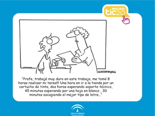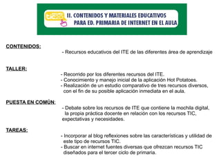 El documento describe un taller sobre recursos educativos digitales. El taller incluye una visita a recursos en el Instituto de Tecnologías Educativas, aprendizaje sobre la aplicación Hot Potatoes, y un estudio comparativo de tres recursos para su posible uso en el aula. Los participantes debatirán sobre recursos digitales y tareas incluyen añadir reflexiones a un blog y buscar más recursos para tercer ciclo de primaria.