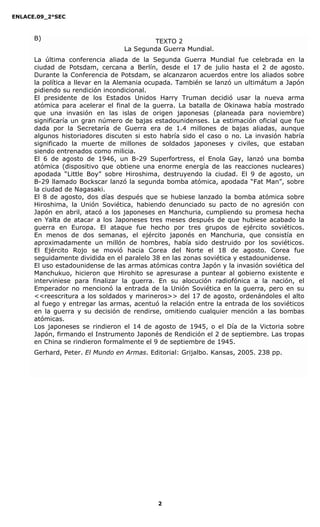 El documento presenta información sobre las causas de la Segunda Guerra Mundial. Menciona que la frustración alemana después de la Primera Guerra Mundial, junto con la inestabilidad política en Alemania, llevaron al advenimiento de Hitler al poder. También señala que la ideología nazi de Alemania e Italia los llevó a intervenir en la guerra civil española de 1936. Además, explica que la Segunda Guerra Mundial surgió del enfrentamiento entre ideologías como el liberalismo democrático, el nazi