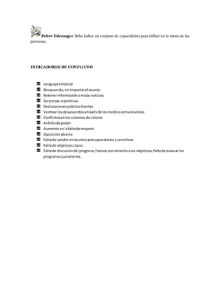 El documento define el conflicto y sus causas, e identifica los principales actores involucrados en el conflicto armado en Colombia. El conflicto se origina en la década de 1960 debido a la exclusión política y social, y la desigual distribución de tierras. Las guerrillas de las FARC y ELN surgieron para oponerse al gobierno, mientras que los paramilitares se alinearon con el estado. El conflicto ha causado violencia generalizada y ha sido impulsado por el narcotráfico. A pesar de algunos intentos de paz